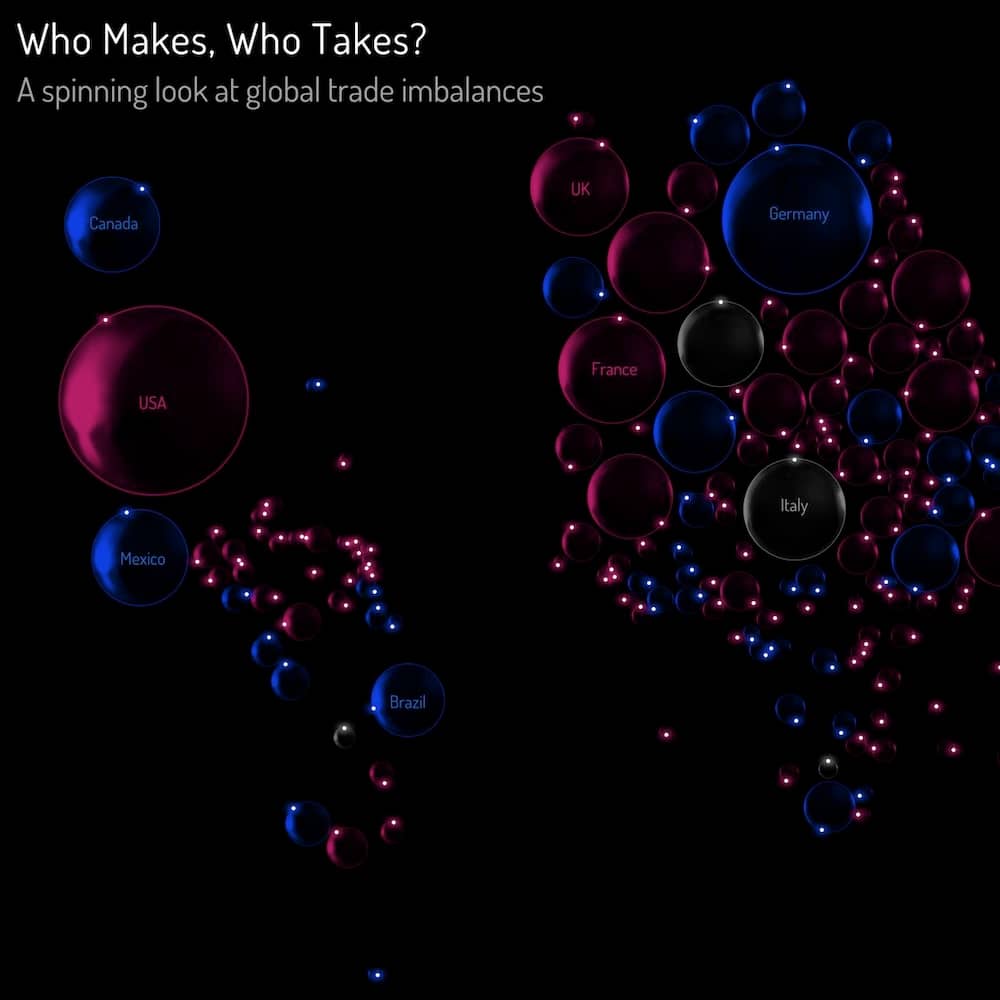 More characteristic visual magic from Mohamad with a 'spinning look' at global trade imbalances through motion: "China exports 56% more than it imports. The U.S. imports 62% more than it exports. Two opposing forces in global trade - one making, one taking".