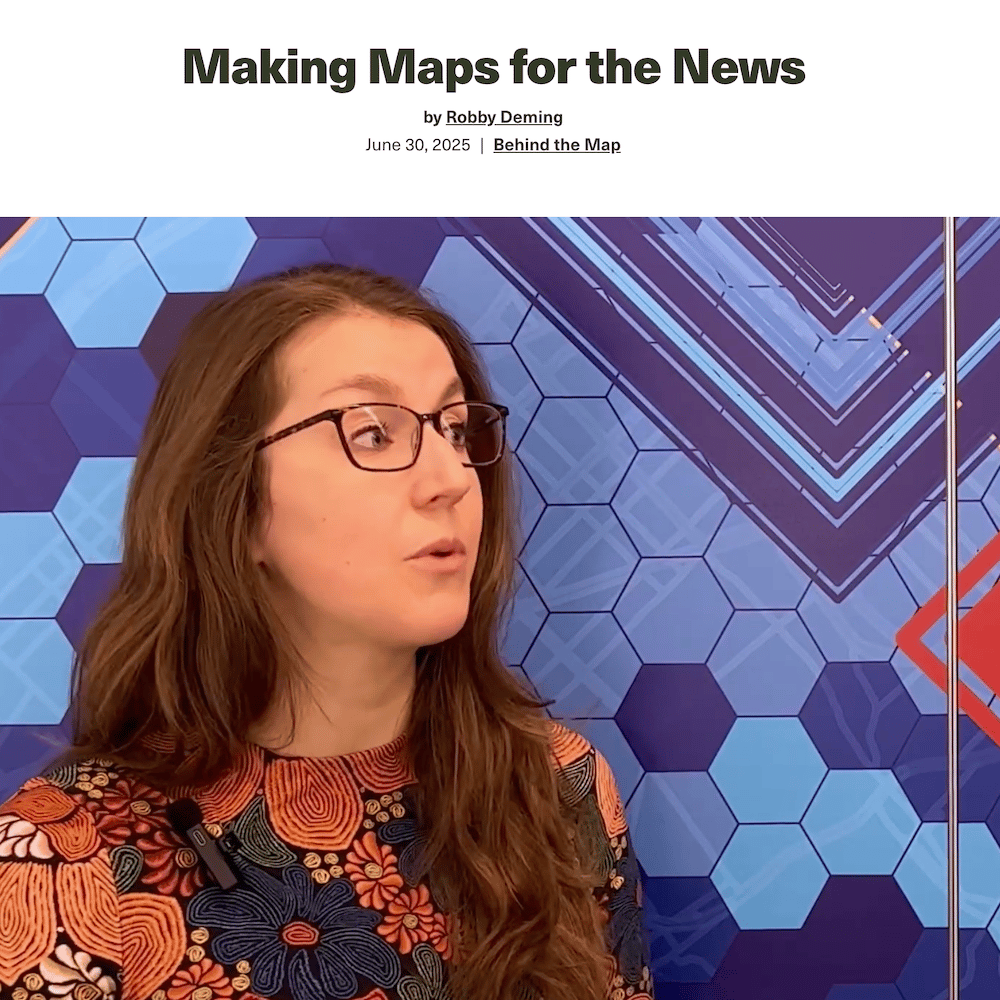 Really nice interview with superstar map maker Lauren Tierney, senior product manager at Esri but formerly a cartographer for The Washington Post and National Geographic: "In this conversation, we discuss a typical day in a newsroom and some of her favorite projects.... (as well as) tips about a cartographic career in journalism."