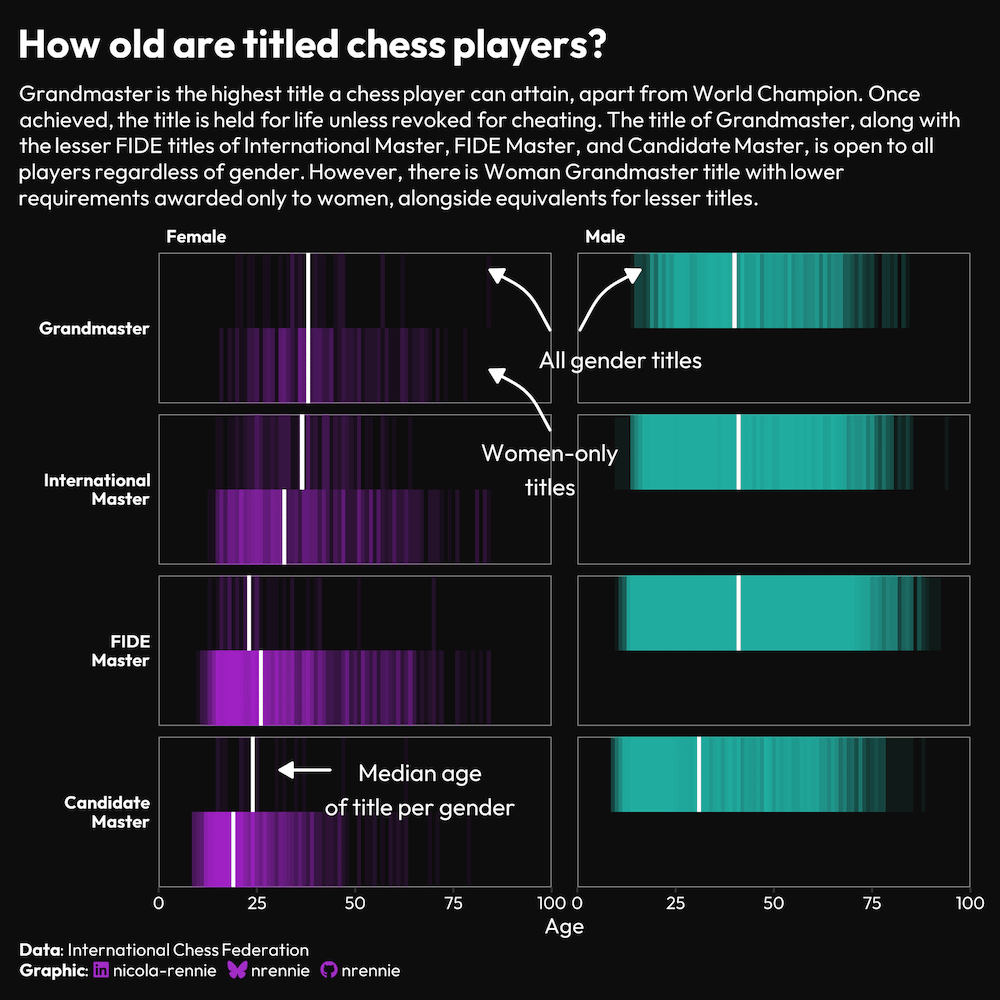Nicola is one of the most prolific publishers of fresh data visualisation pieces, mainly for her wonderful commitment to the #TidyTuesday series. Here she's made a lovely 'annotated barcode plot to show the distribution of age by title' but the main reason for inclusion in this newsletter is simply encouragement to just go follow all her work.