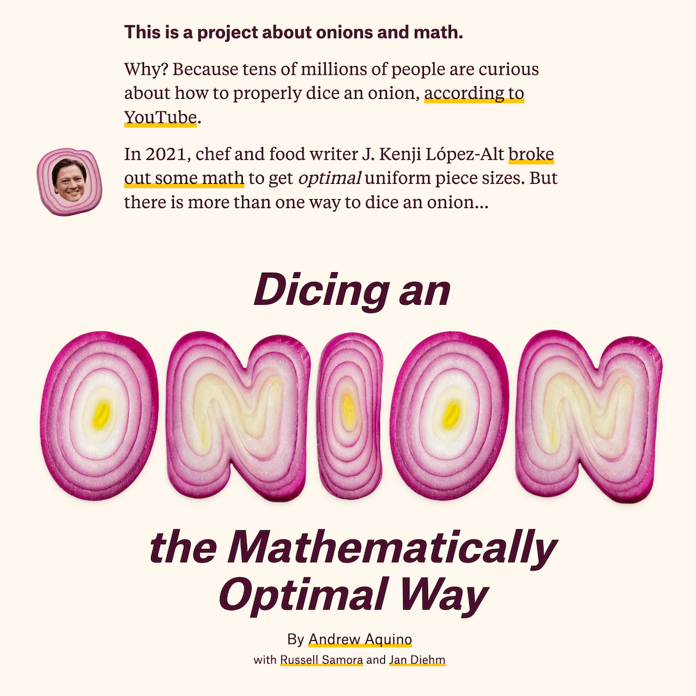 Andrew Aquino's debut on The Pudding is a cracker, looking at the mathematics behind optimal dicing of onions. It would be merited for inclusion based on the eye-wateringly splendid red-onion title typeface alone.