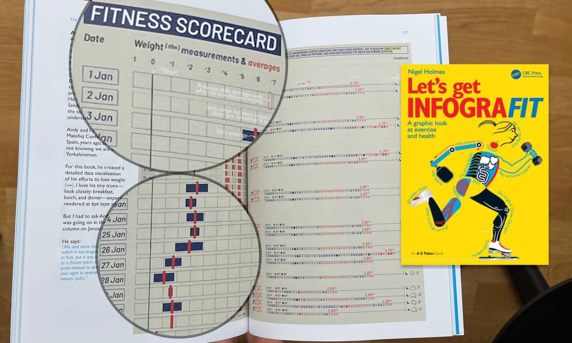 I’m thrilled to see a visualisation I created has been included in a new graphics book by the magnificent man-in-blue, Nigel Holmes, titled ‘Let’s Get Infografit: A Graphic Look at Exercise and Health‘. In this post I share a few more details and include a few additional shots of this visualisation piece.